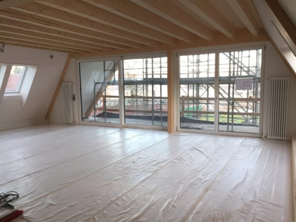 Die Zimmermänner haben im Obergeschoss alle Böden fertig verlegt …
