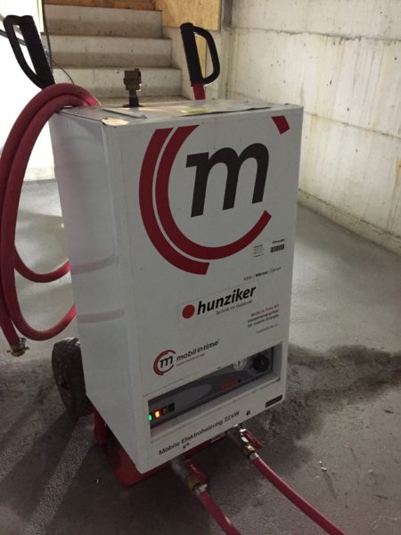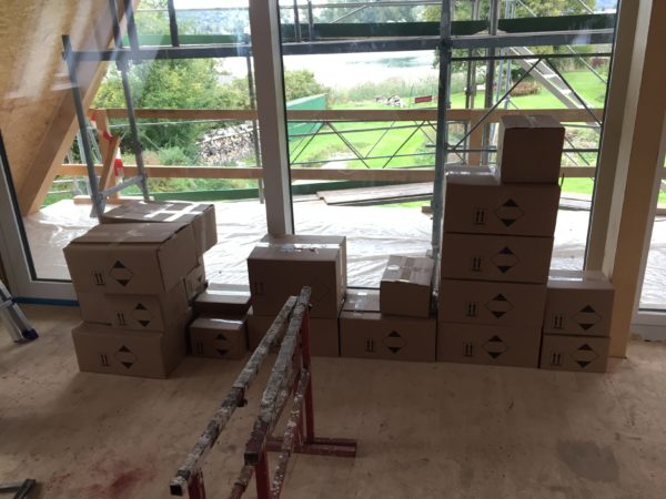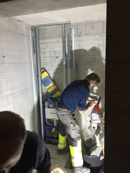 Die Bodenheizung ist bereits an ein Elektroheizgerät angeschlossen, aber nicht unbedingt, dass die Arbeiter in der Wärme arbeiten können, sondern um den Unterlagsboden langsam austrocknen zu lassen. Trotzdem, es ist bei diesem Sauwetter angenehm warm im Haus.Sogar der Baumeister selber, Hannes Moosberger, legt Hand an beim Bohren.Auf der Baustelle sind die speziellen Epoxyfarben angekommen …… und bei uns Zuhause kommen beinahe täglich Schachteln mit Einrichtungssachen an. Der Päcklipöstler wundert sich schon lange, wo all diese Dinge im Haus wohl versteckt werden.Aber auch draussen sind die Spengler am Einkleiden.