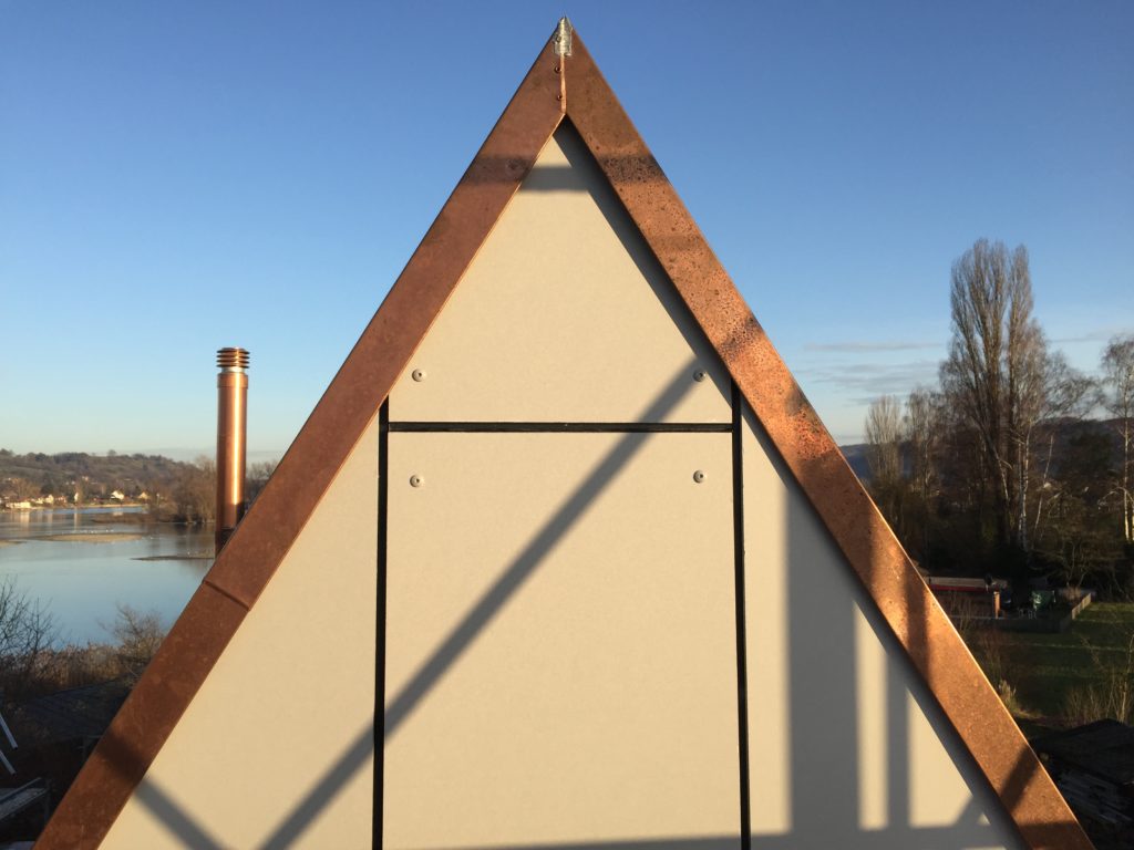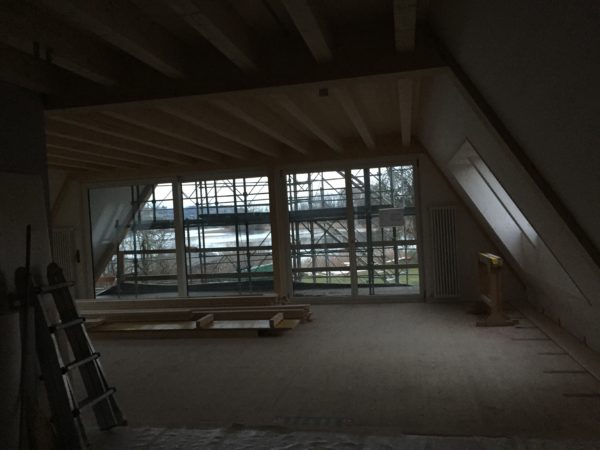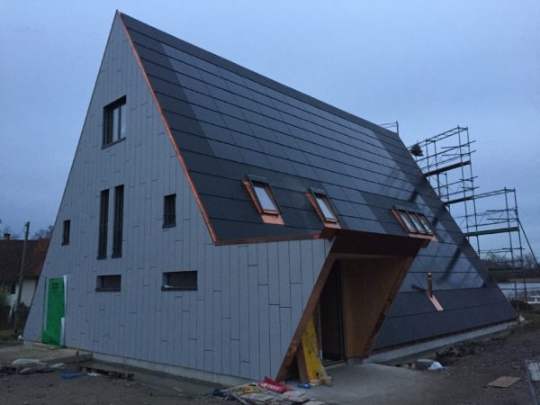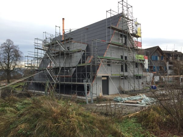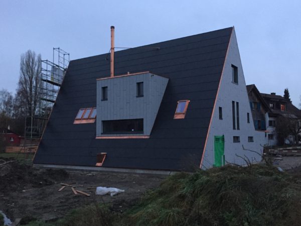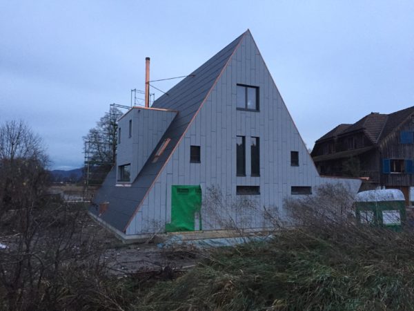 Dach und Fassade sind diese Woche fertig geworden, zumindest vorläufig, Kägi & Isler haben mit grossem Fachwissen und Sorgfalt den Löchligaischt mit Grau und Anthrazit eingekleidet. Nur, man/frau sieht es einfach noch nicht so richtig.Gestern kam das Gerüst weg, die Hülle ist gefallen und jetzt sind die Linien sehr klar.Die Nordseite, das Gesicht mit offenem Mund, der einen Bartstoppel und dem grossen Zeigefinger neben dem Kopf, schaut zu den Nachbarn rüber.Auch das Gegenschräg des Eingangs ist nun nachvollziehbar. Wenn ich oben gesagt habe, dass die Fassaden und Dachflächen vorläufig fertig sind, dann weil das Süddach und insbesondere die Photovoltaik noch eine grundsätzliche Umschichtung erfahren wird.Bevor das Gerüst aber wegkam, schaute ich mir die Arbeit der Firma Angst (Spengler) noch von nahmen an: Eindrückliche Arbeit, die insbesondere dem Wasser eindeutige Wege weisen wird.Da geht Luft aus dem Haus raus, aber kein Wasser darf rein – spannende Arbeit und Lösungen.Aber auch drinnen ist die Zeit nicht stehen geblieben, die Zimmermänner haben Bodenriemen gelegt, die Wände und Decken haben mehr Farbe bekommen, Röhrli haben Drähte bekommen und Aussparungen Stecker und Schalter. In der Küche haben Chromstahlkuben ihren Platz eingenommen und einige Rohre und Röhrli haben sich mit Wasser gefüllt. Jetzt ist für Weihnachten Ruhe eingekehrt, Werkzeug und Maschinen weggeräumt worden und der Boden gekehrt.Die Bucht ist im Winterschlaf und ich wünsche allen einen ruhigen Gang bis Ende Jahr und dann wieder viel Elan für das 2020. Herzlichen Dank an Alle, die sich für unseren Löchligaischt mit Leib und Seele einsetzen.