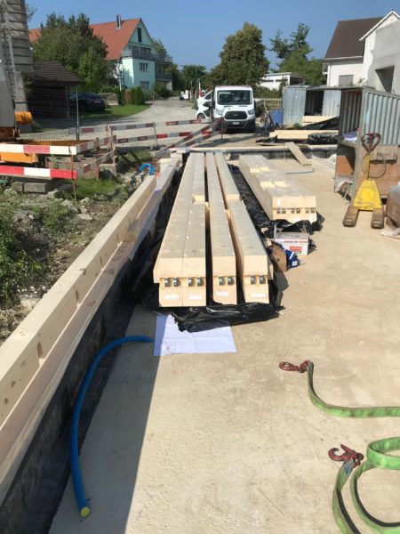 Heute ist das erste Holz angeliefert, …… die grossen Dreiecke zusammengeschraubt, …… und in der Wiese gelagert worden.Die Schalung und alle Einlagen für die oberste Betonschicht ist bereit und wird noch heute, vor dem Feierabend betoniert. Danke Fridl für die Fotos.