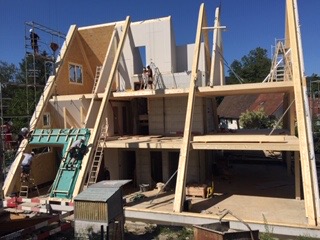 Beinahe wie ein Puppenhaus, gibts für Kurz die Einsicht in das neue Haus. (Danke Cornelia für das Titelbild und dieses hier.)Wohnen im 1. Obergeschoss, in der Betonwand die Einbuchtungen für die Kaffee- und Espressotassen – viel Licht von drei Seiten.Cornelia, Fridl, Andrea, Markus, Elisabeth, Noam, Susi und ich können zum ersten Mal die Räume in Wirklichkeit begehen – was für eine Erfahrung. Und da es noch einmal wunderbares, warmes Wetter war, stand einem Openair-Grillabend nichts im Wege.Der Blick aus dem Dachgeschoss, bereits durch das Fenster – das wird ein wunderbarer Ausblick, mit der Morgensonne als Wecker.Noam geniesst die selbe Aussicht vom Gerüst.