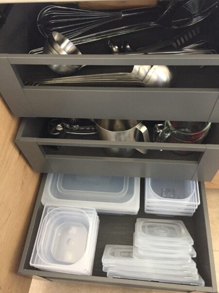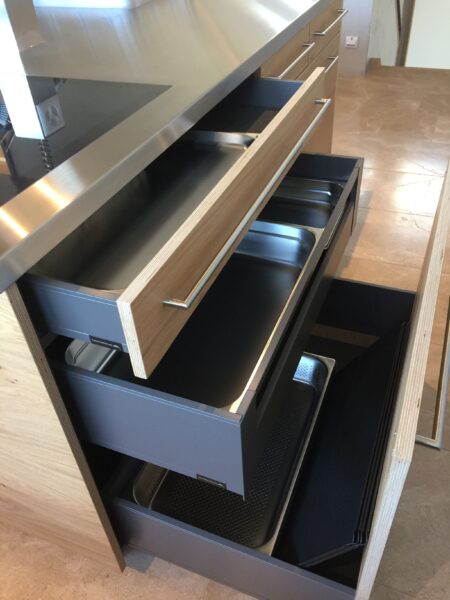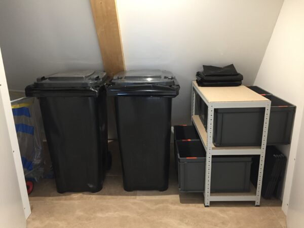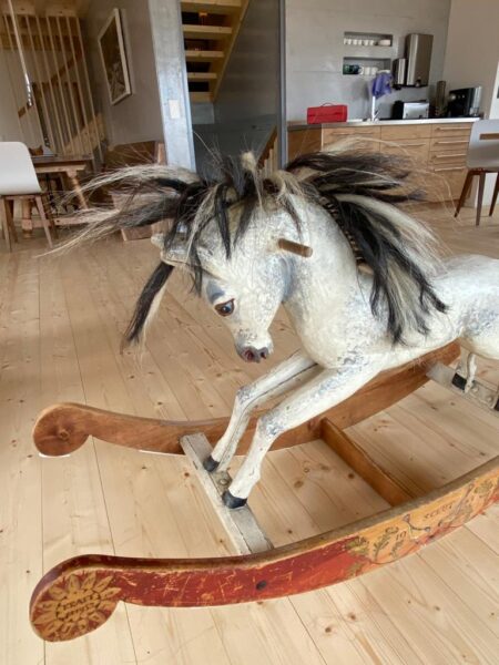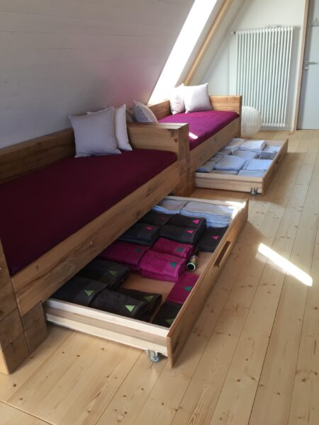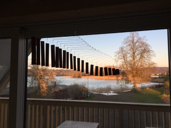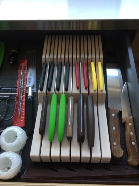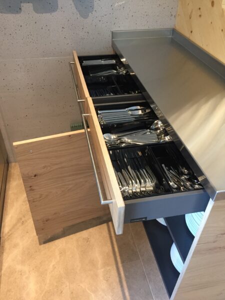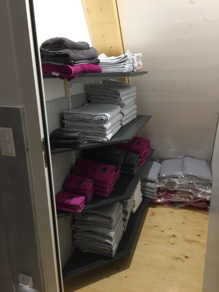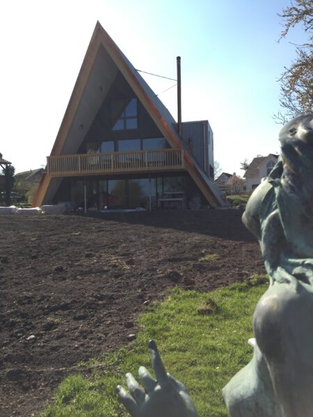 Nach langer Zeit mit Blick nur zum Wasser, gönne ich jetzt der Liesel wieder den Blick hinauf zum neuen Löchligaischt. Hoffe dieser Anblick erquickt Ihr Herz hinter ihrer Brust.Eine weitere Sicht, beinahe durch ein Herz, auf das Herz der Nilibucht – Bank mit Seesicht. Aber nun zu den inneren Innereien: Im Technikraum zeigt der Digitalscreen, dass eben gut 20000 Watt auf dem Solardach geleistet wird. Diese Leistung wird in Batterien, Heiz- und Warmwasser gespeichert, oder direkt im Haus verbraucht.Hinter der Front im Gang des Erdgeschosses versteckt sich die Entsorgung,ein Feuerlöscher, die Erste-Hilfe-Apotheke, das Stuhllagerdie Reinigung, alle Akkuladestationen, das Flipchart und ein Grossbildschirm.In der Küche haben die Gewürze ihren Platz gefunden.Beinahe die letzten grossen Einkäufe, das ganze Küchenmaterial, haben ihre Plätze in all den vielen Schränken gefunden:– viele scharfe Messer– unterschiedlichste Gastronorm-Bleche– natürlich das Besteck und alle Teller darunter– ein Kasten voll, hauptsächlich fürs TrinkenDas Gampiross hat zwar keine Innereien bekommen, dafür umso mehr freakige Mähnenhaare, danke Cornelia.Für die Schlafzimmer im Obergeschoss sind zwei grosse Schubladen mit Bett- und Frotteewäsche gefüllt, …… im Dachgeschoss hat es dazu einen Schlupf.Das Mobilé von Tim Prentice schwingt wieder mit allen Luft- und anderen Bewegungen im Haus, wahrscheinlich hat es mit dem Löchligaischt auch einen Pakt geschlossen.