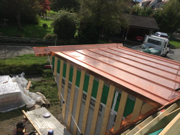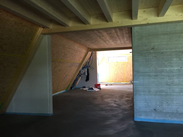Nun ist wieder ein grosser Schritt getan, die Isolation und Bodenheizung ist nun eingegossen und wartet auf den kroatischen Naturstein – die Räume werden immer mehr erlebbar.Der breite Gang zum Eingang.Aber nicht nur drinnen geht die Arbeit voran, die Spengler sind am Einkleiden des Eingangs und der Dachdecker und die Elektriker haben das Süddach für die Photovoltaik vorbereitet.